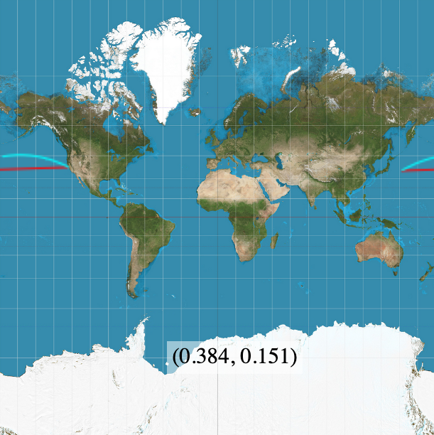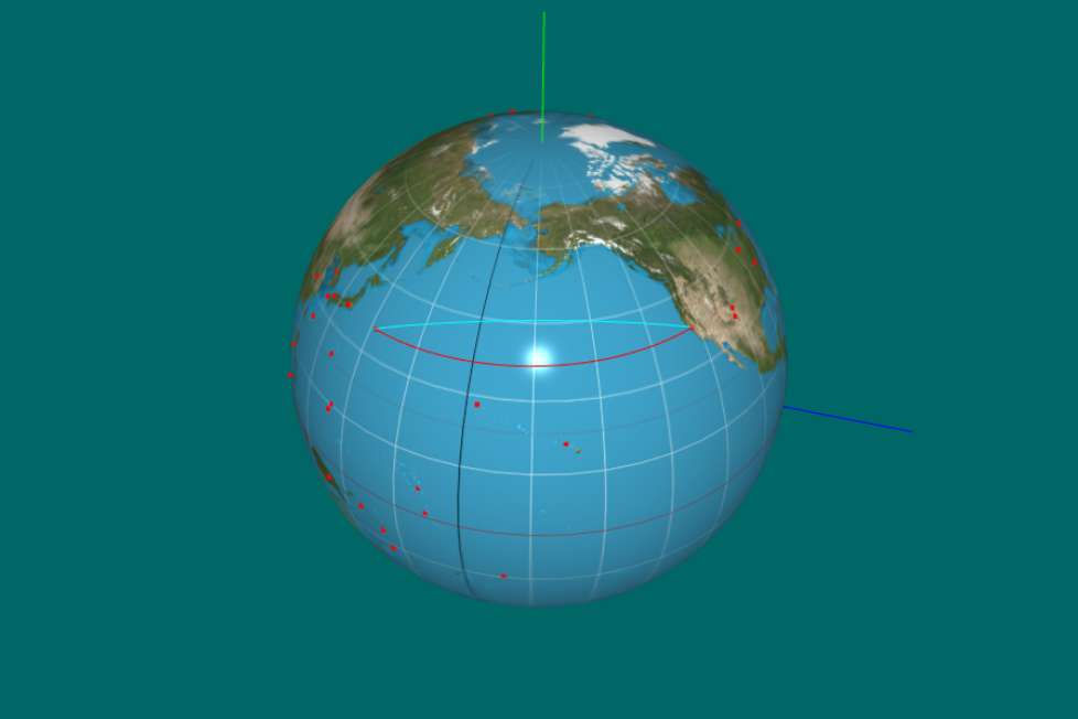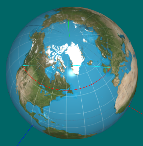 Current forward vector (0,0,1) or (-90°,0°) in GCS coordinates, which corresponds to the z-axis in the intrinsic frame and where the phong highlight position is set on the globe.